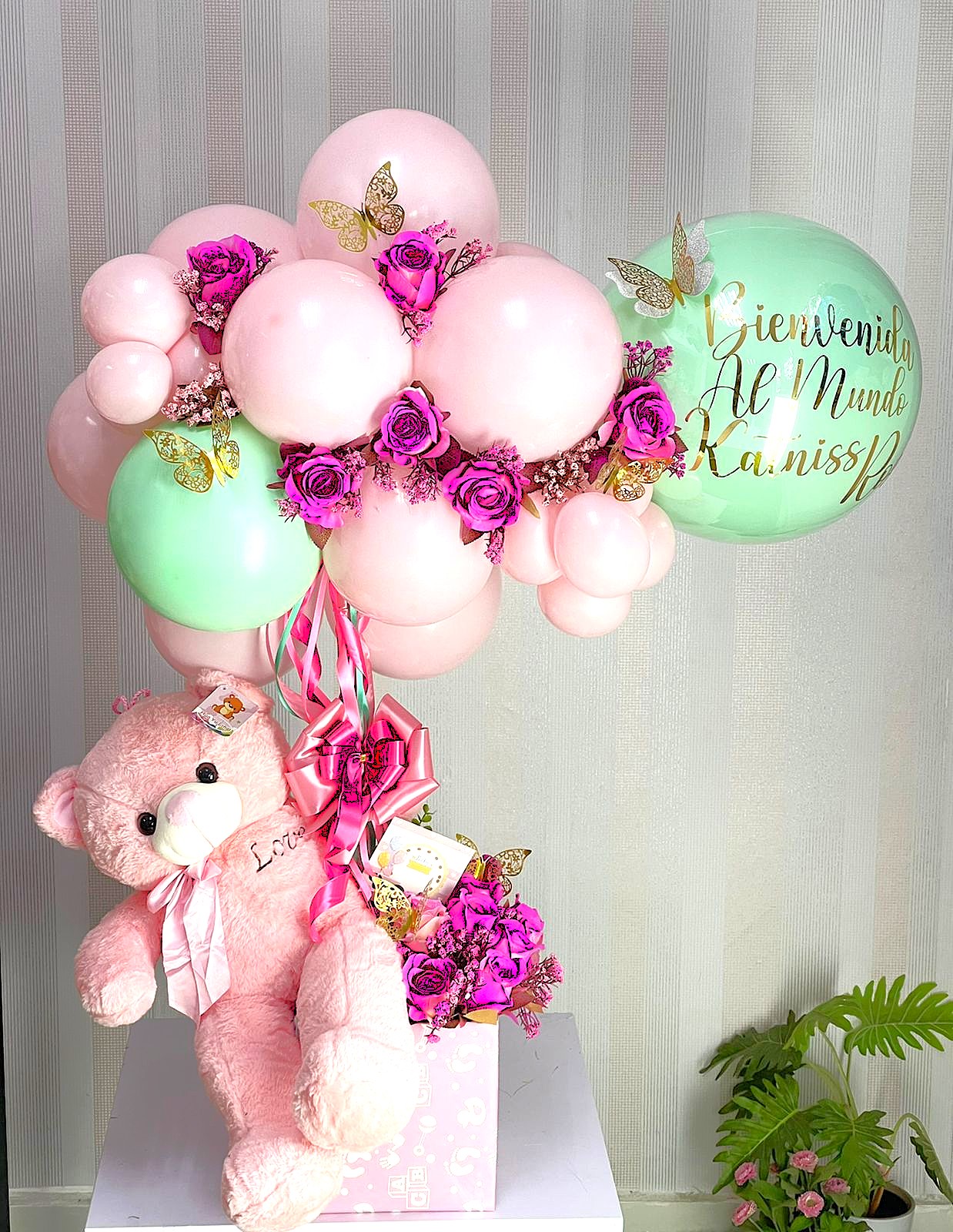 • Consta de una base de globos o una caja, un peluche grande, 1 burbuja con personalización. La presentación puede ser con 12 flores artificiales, 6 mariposas, o detalles en globoflexia. como se muestra en la galería.
